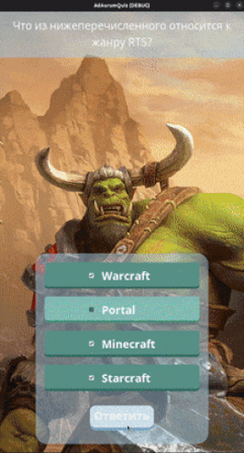 The game features a simple quiz loop where players cananswer questions and view the correct answers. Incorrect choices are highlighted in red. After completing all the questions, players can view basic statistics of their answers. Additionally, users have the option to set the maximum number of answers to be displayed.